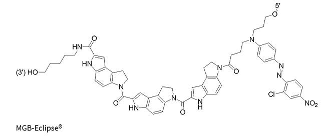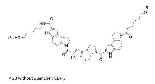 The MGB molecule forms highly stable complexes with target DNA, allowing for shorter probe designs for better specificity and mismatch discrimination, thus improving quenching efficiency. MGB probes are particularly effective at stabilizing A/T-rich duplexes compared to G/C-rich duplexes.