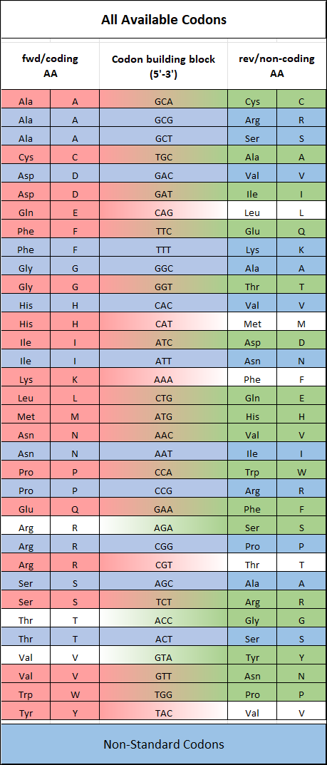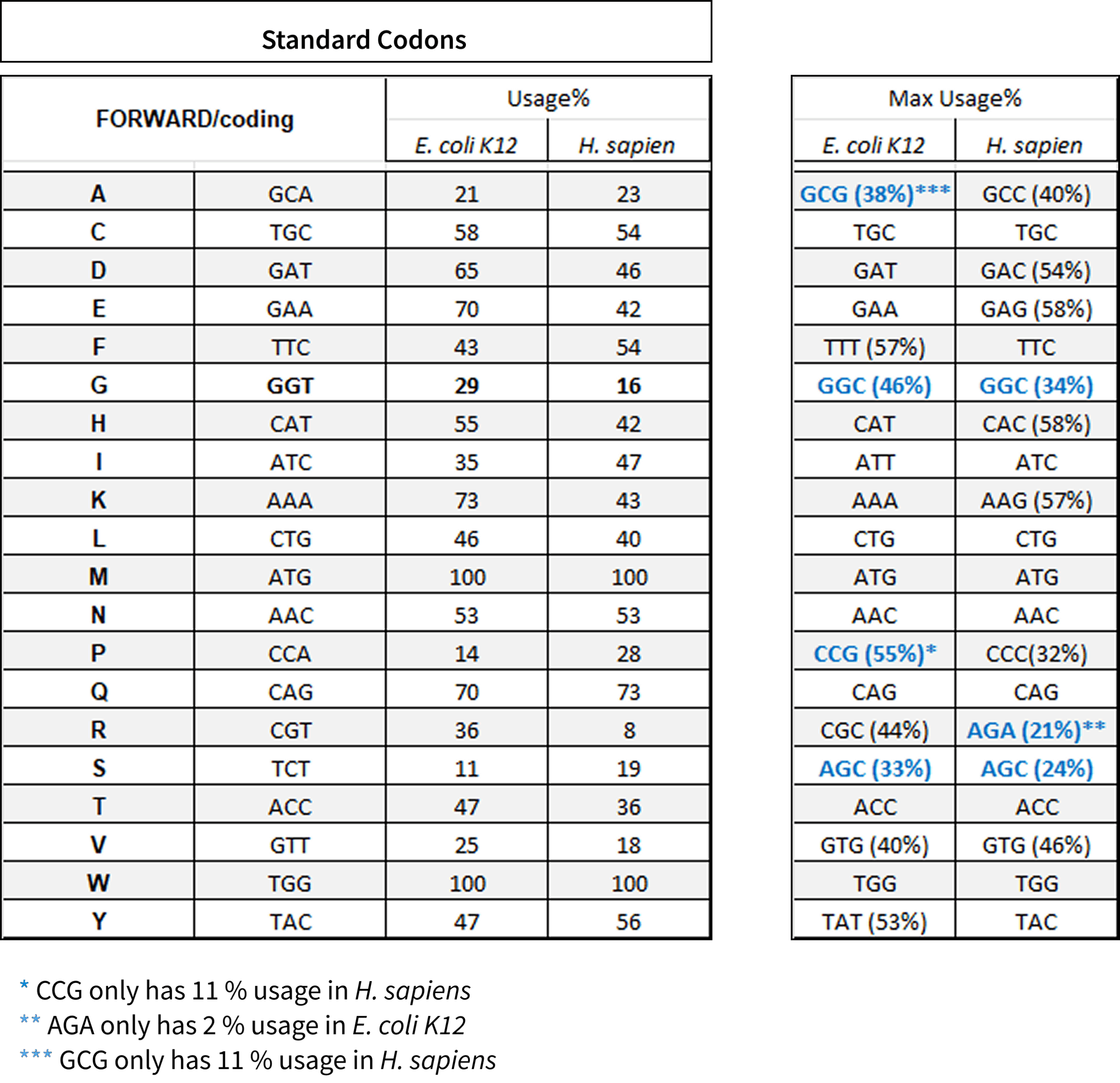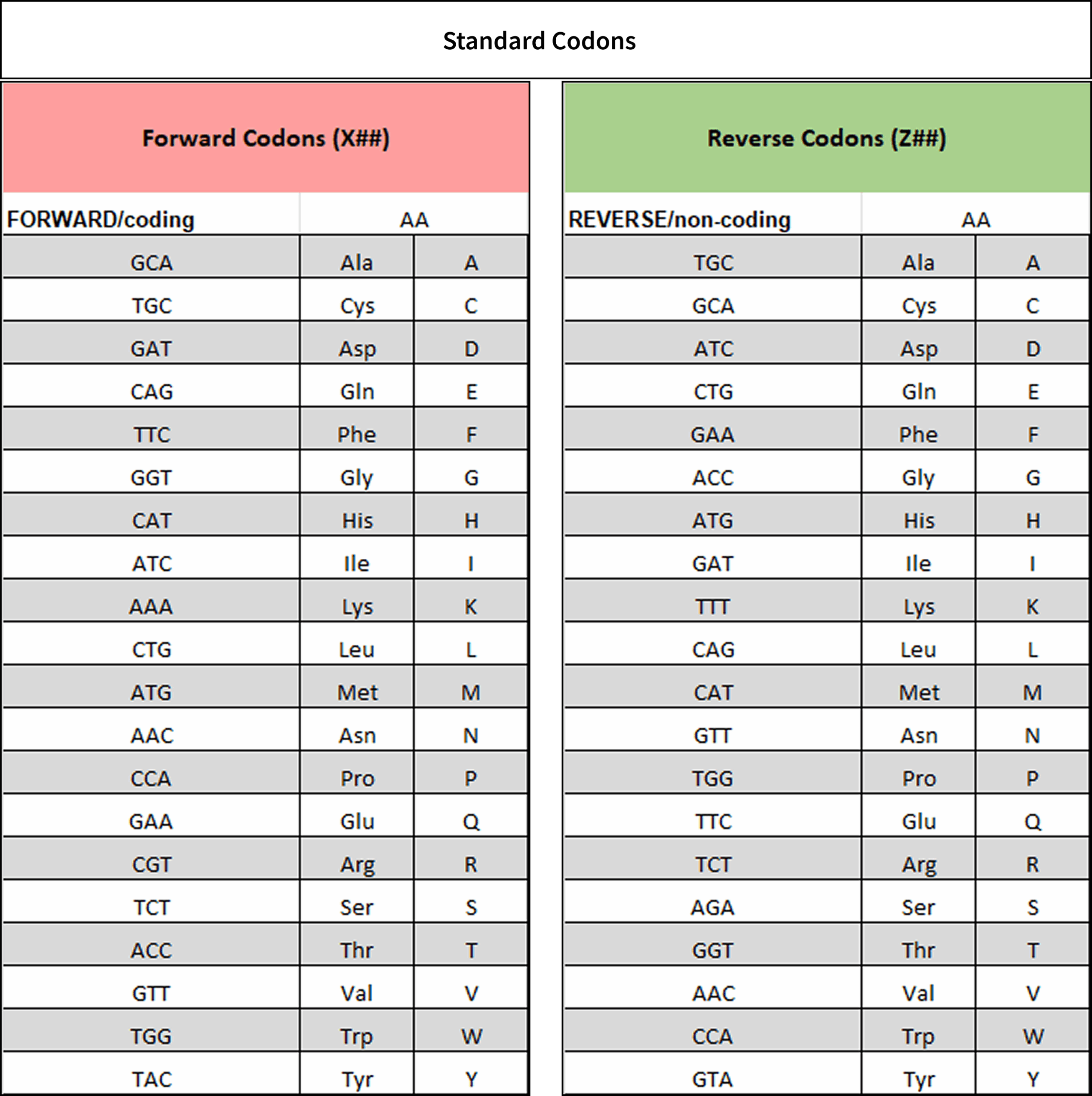 In addition, G/C-rich codons are generally avoided in standard codon sets whenever possible, as they are more difficult to synthesize with high purity and can increase the G/C ratio in oligonucleotides, potentially leading to unwanted secondary structures. As a result, we cannot always provide identical forward (coding) and reverse (non-coding) codons, as some sequences are intentionally excluded to optimize quality and performance.