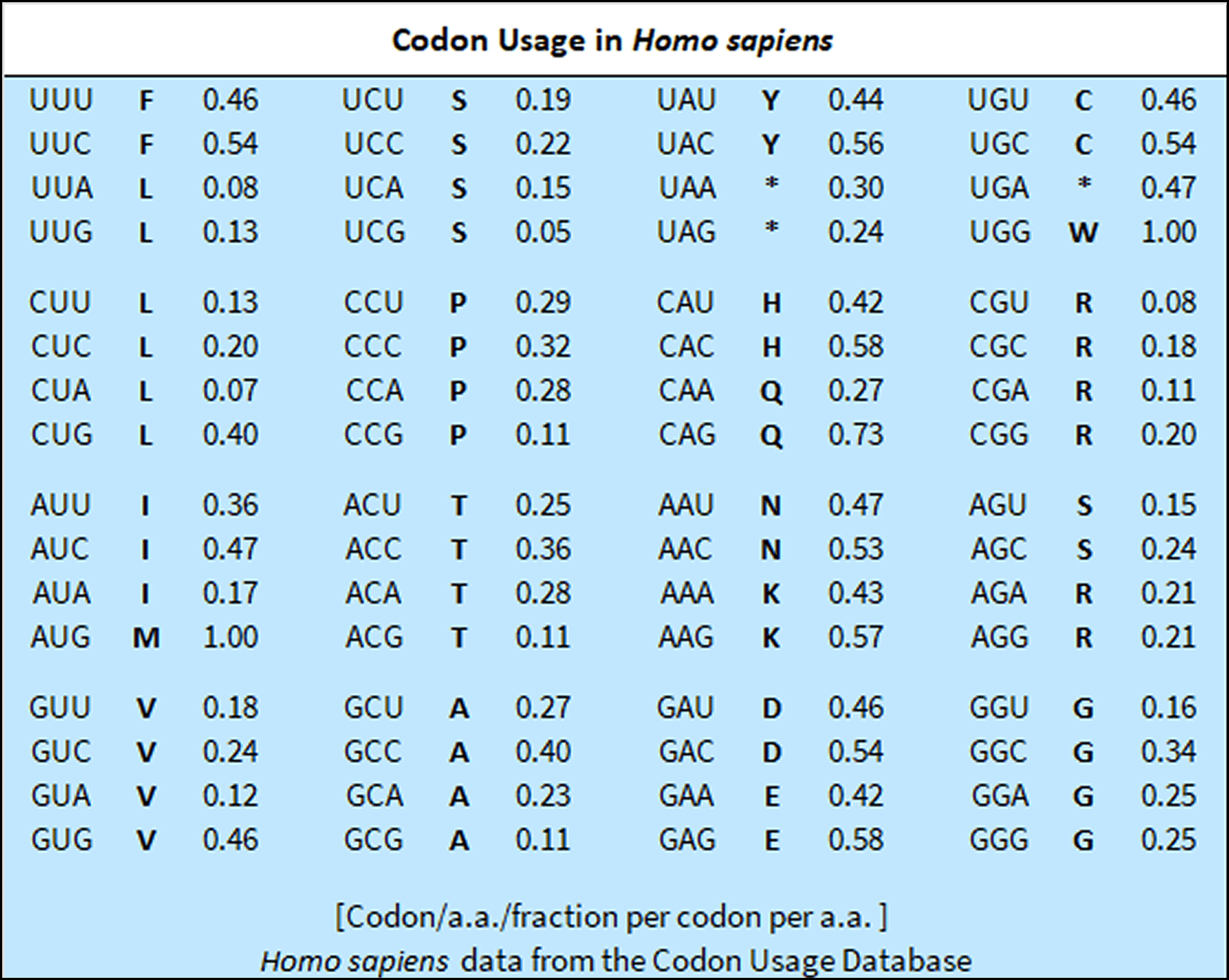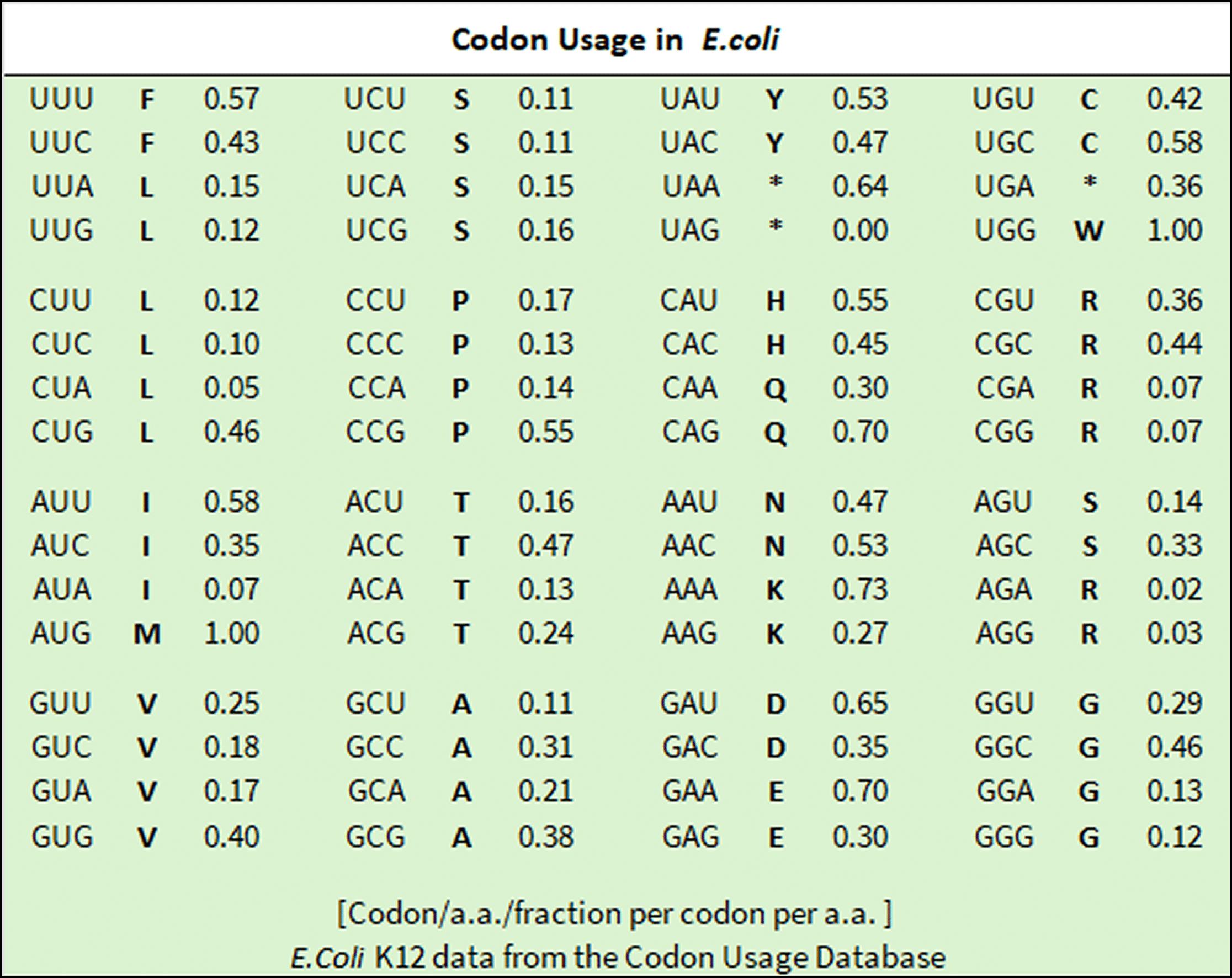 These codons have been chosen as an optimized hybrid set for E. coli and H. sapiens. (see Codon usage)